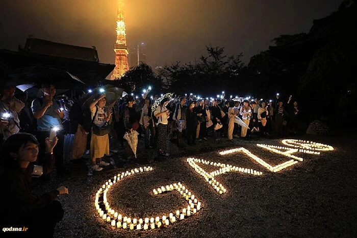 مردم ژاپن در هوای بارانی، شمعهای روشن را به نحوی روی زمین قرار دادند که کلمه «غزه» نقش ببندد.