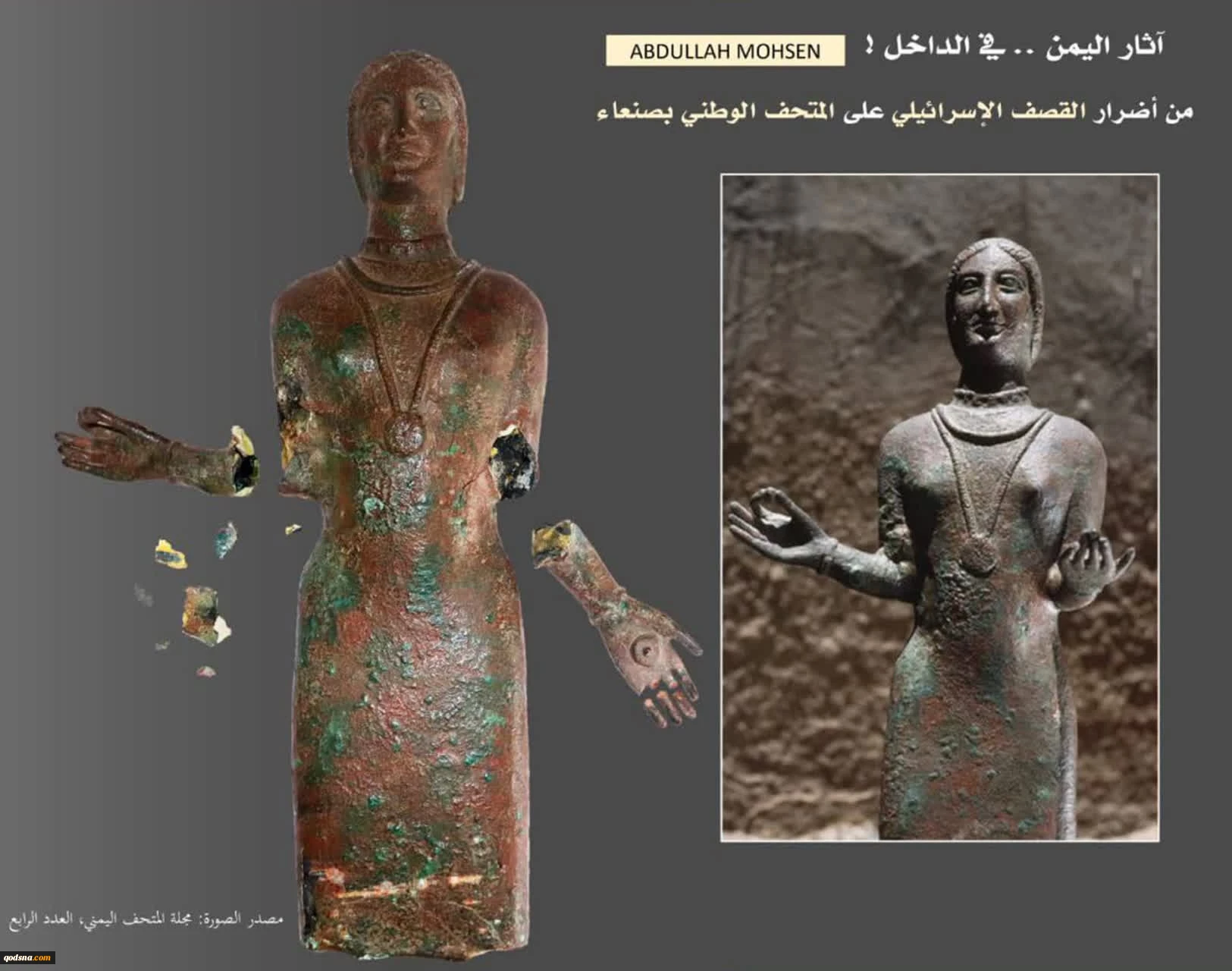 به گزارش خبرگزاری قدس (قدسنا)، این حملات باعث تخریب بخش‌های وسیعی از امکانات موزه و آسیب دیدن ۳۴ قطعه عتیقه نادر متعلق به دوران پیش از میلاد، از جمله مجسمه برنزی مشهور «بانوی البخور» متعلق به قرن پنجم پیش از میلاد و مجسمه برنزی آهو شد‌ه است.