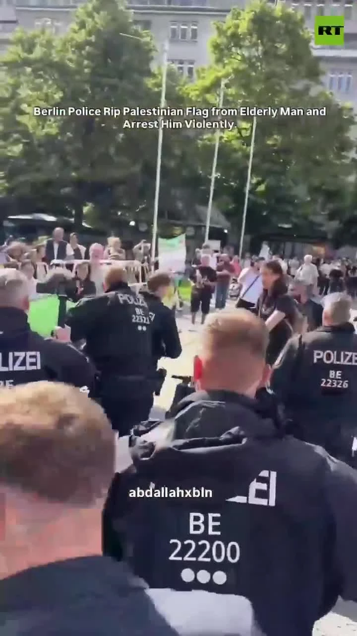 پلیس آلمان مرد پیری را به‌جرم حمل پرچم فلسطین و حمایت از مردم مظلوم غزه به‌طور خشونت‌باری دستگیر کردد.