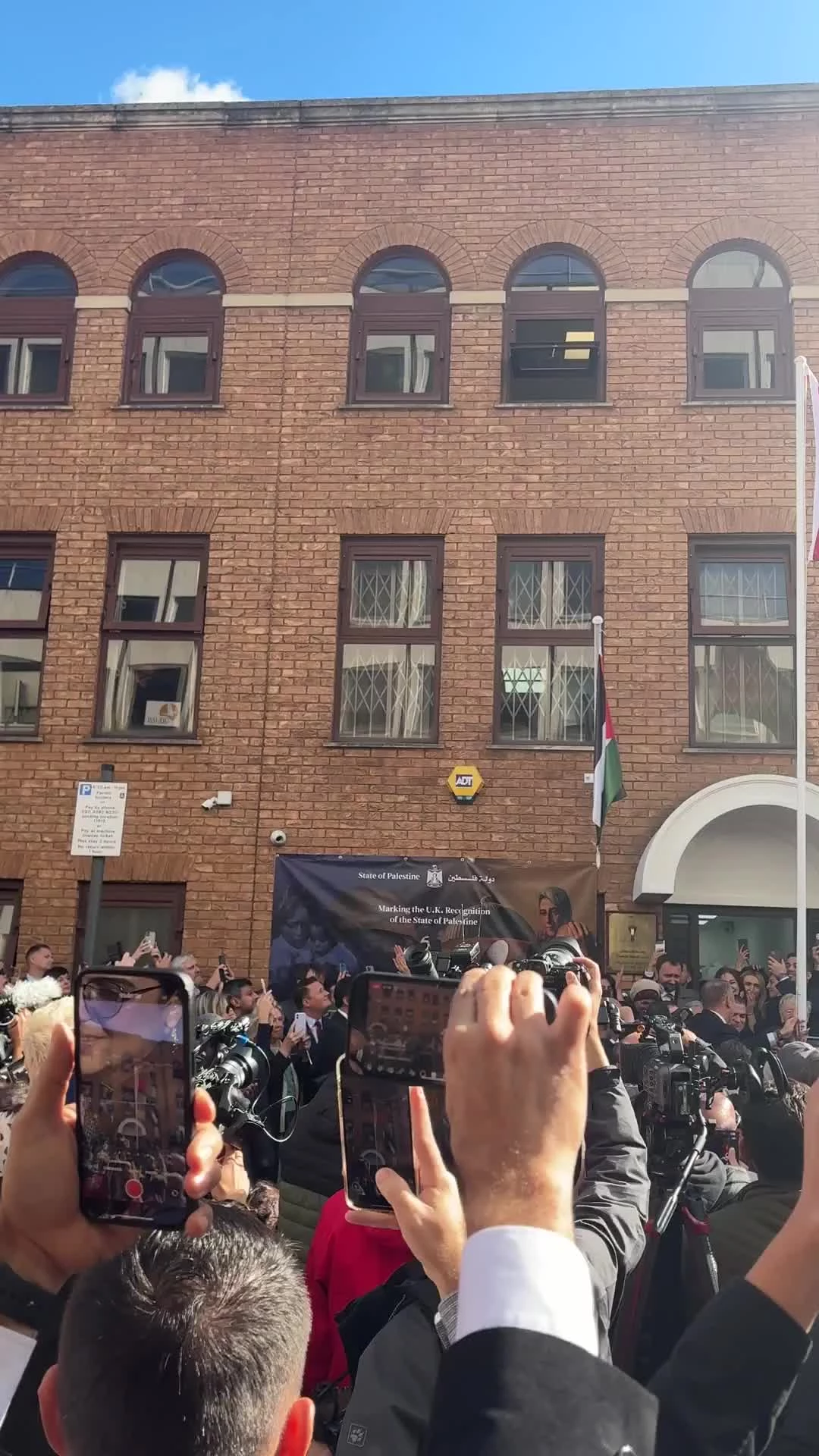 برافراشته‌شدن پرچم فلسطین در مقابل ساختمان نمایندگی دیپلماتیک این کشور در لندن