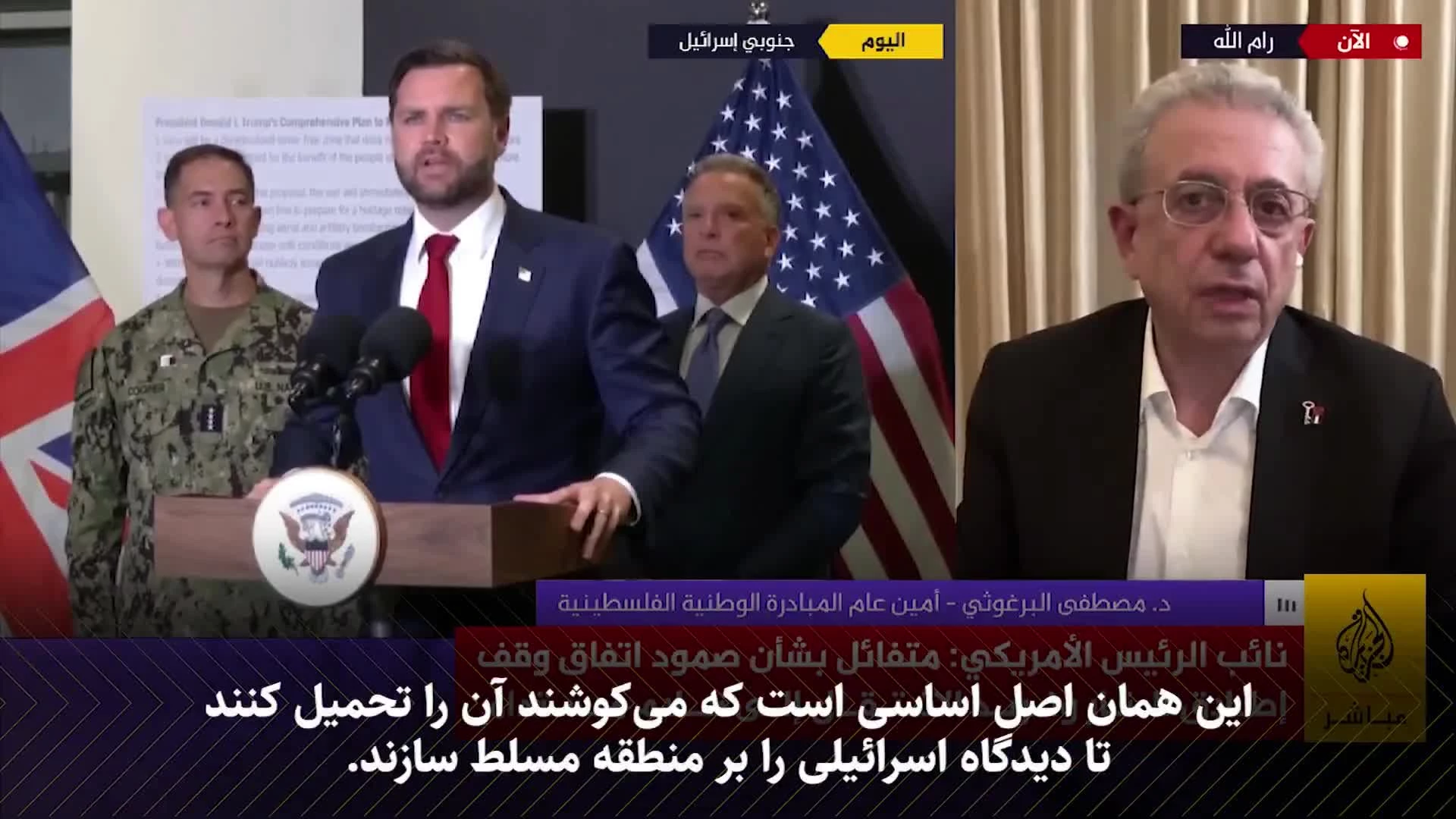 مصطفی البرغوثی دبیرکل جنبش «ابتکار ملی فلسطین» و کارشناس الجزیره: سخن نتانیاهو در پاسخ به پرسشی درباره طرح «اسرائیل بزرگ» کافی است تا همه بفهمند که هیچ کشوری در این منطقه از شر این متجاوز اسرائیلی در امان نیست . ???? اگر قرار باشد بحث خلع سلاح حماس صورت گیرد، باید پرسشهای دیگری از سوی فلسطینیها مطرح شود، مثلاً چرا سلاح شهرکنشینان در کرانهی باختری جمعآوری نمیشود؟ به چه حقی این شهرکنشینانِ تروریست با سلاح آزادانه در رفتوآمدند و هر روز به مردم حمله میکنند؟ ????وقتی سخن از خلع سلاح در منطقهای به میان میآید، چرا از خلع سلاح ارتش رژیم صهیونیستی در مرزها سخنی نمیگویند؟ چگونه میخواهیم وارد مرحله دوم توافق شویم در حالیکه اسرائیل هنوز مرحلهی اول را اجرا نکرده است؟"
