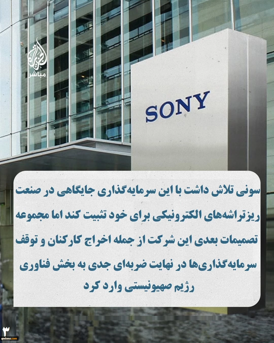 ????شرکت ژاپنی «سونی» اعلام کرد فعالیتش را در حوزه ریزتراشه‌های الکترونیکی در اراضی اشغالی، که ۲۱۲ میلیون دلار در آن سرمایه‌گذاری کرده بود، متوقف می‌کند. اقدامی که ضرب